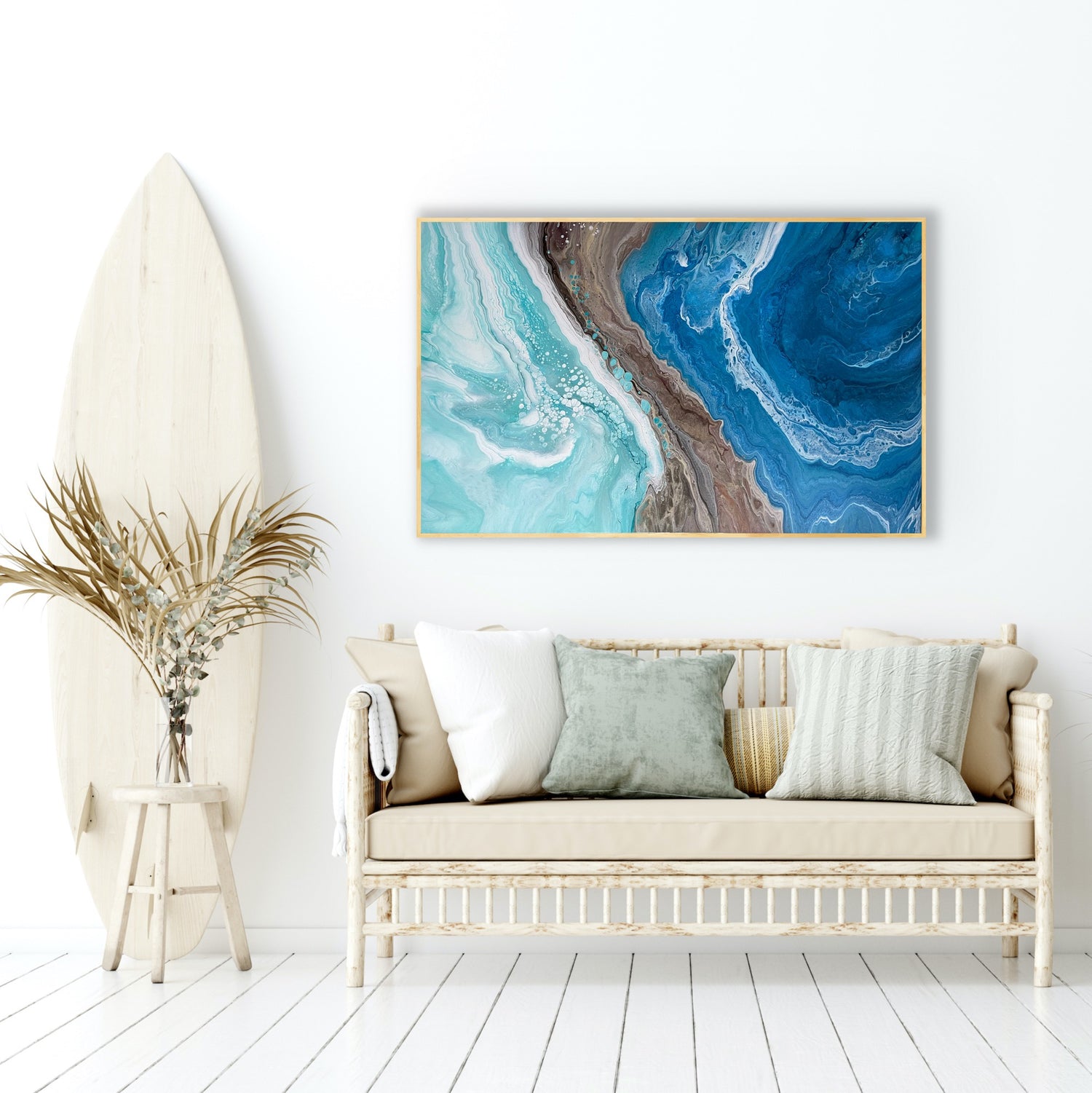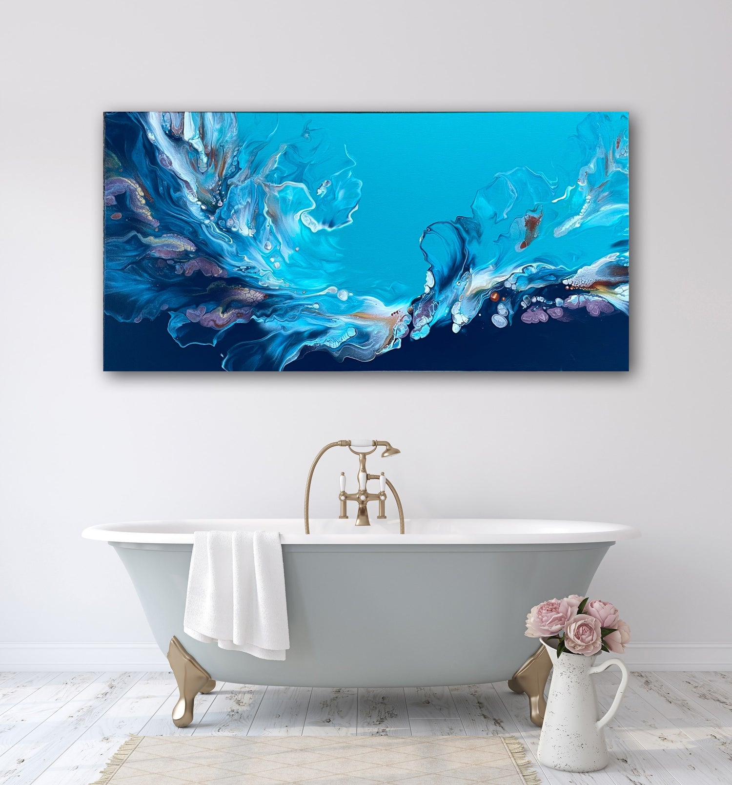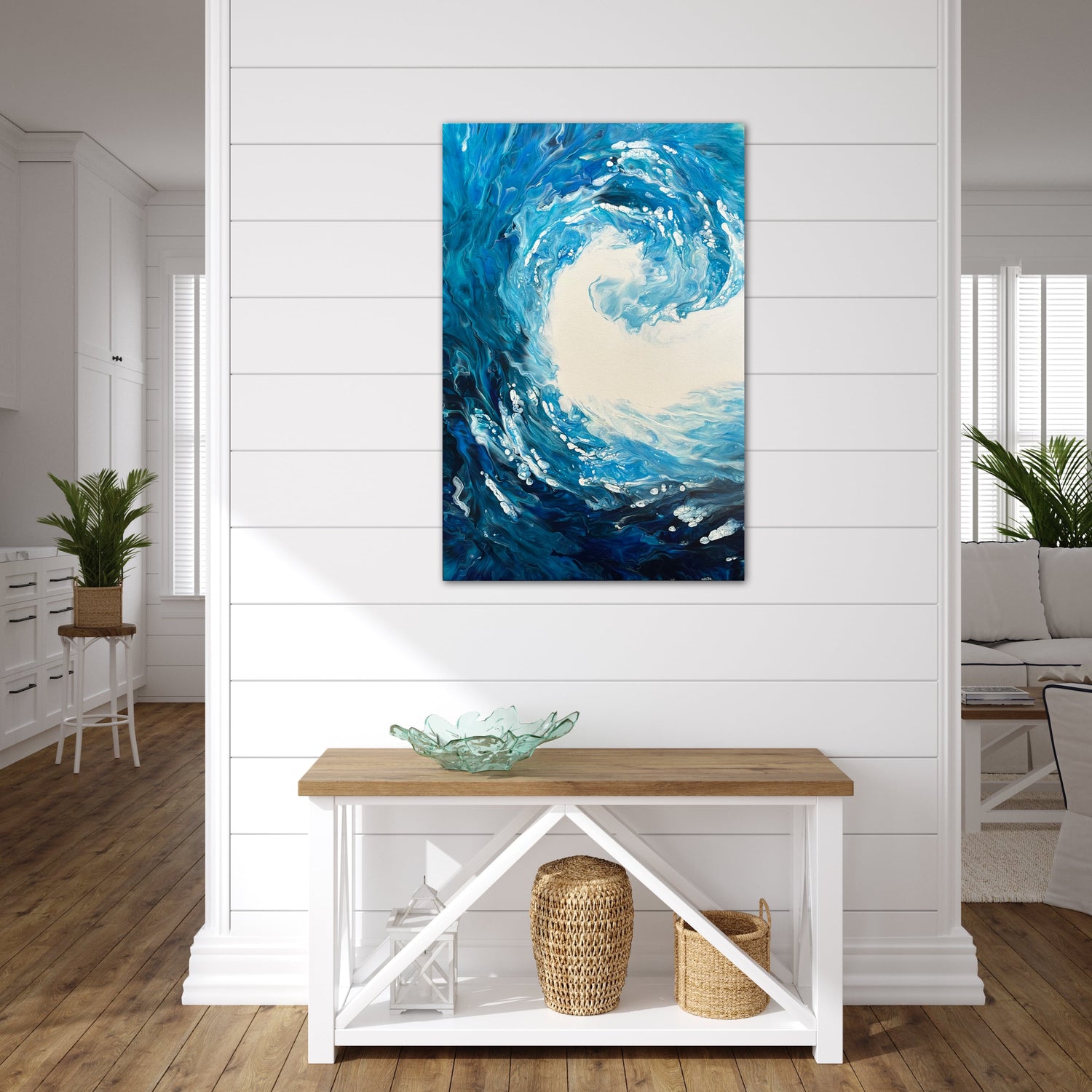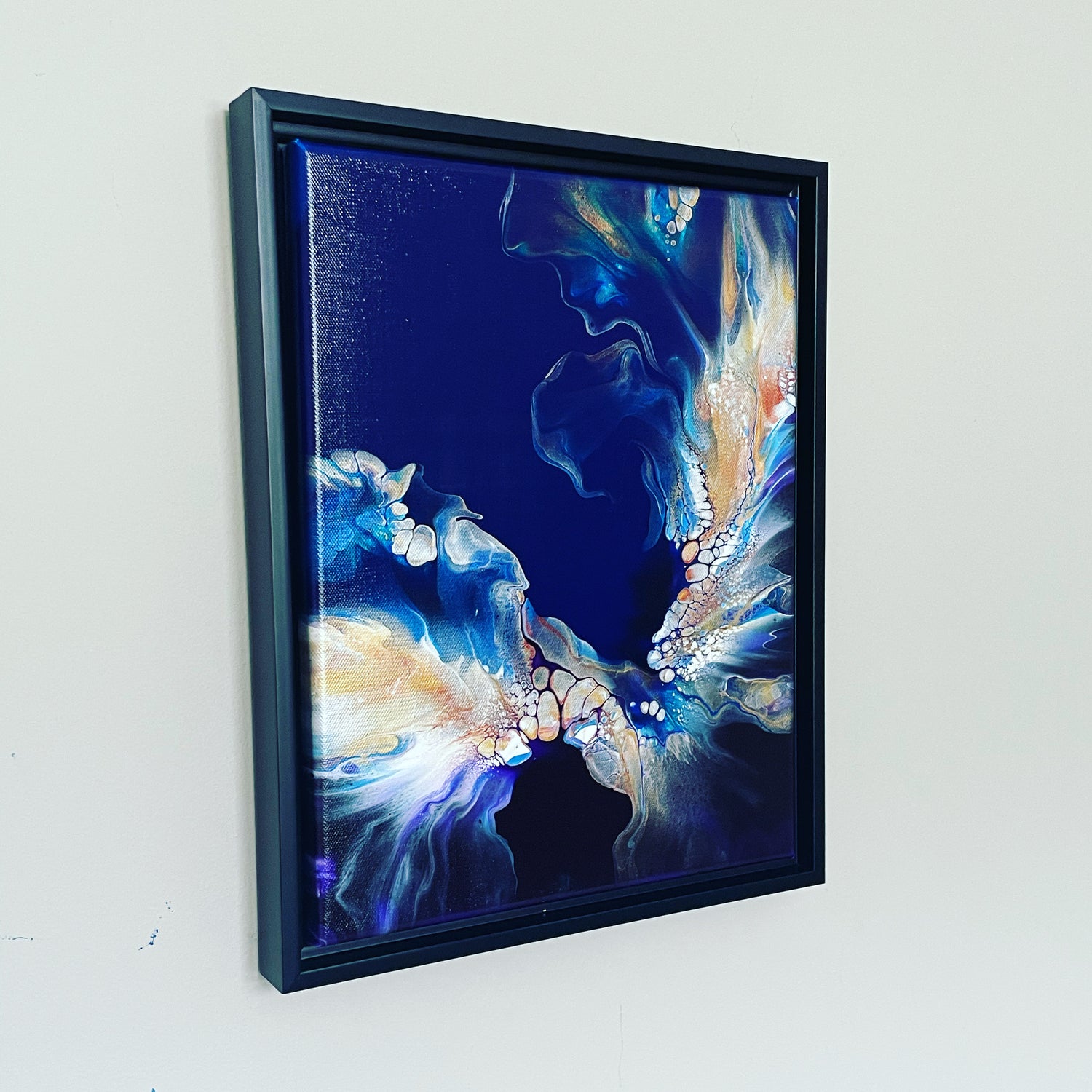 An acrylic fluid art painting made to look like the crashing of an ocean wave. Colors gradiating from dark to light as the wave crests draws the eye up the painting, and invites the viewer to explore new possibilities. SOLD.