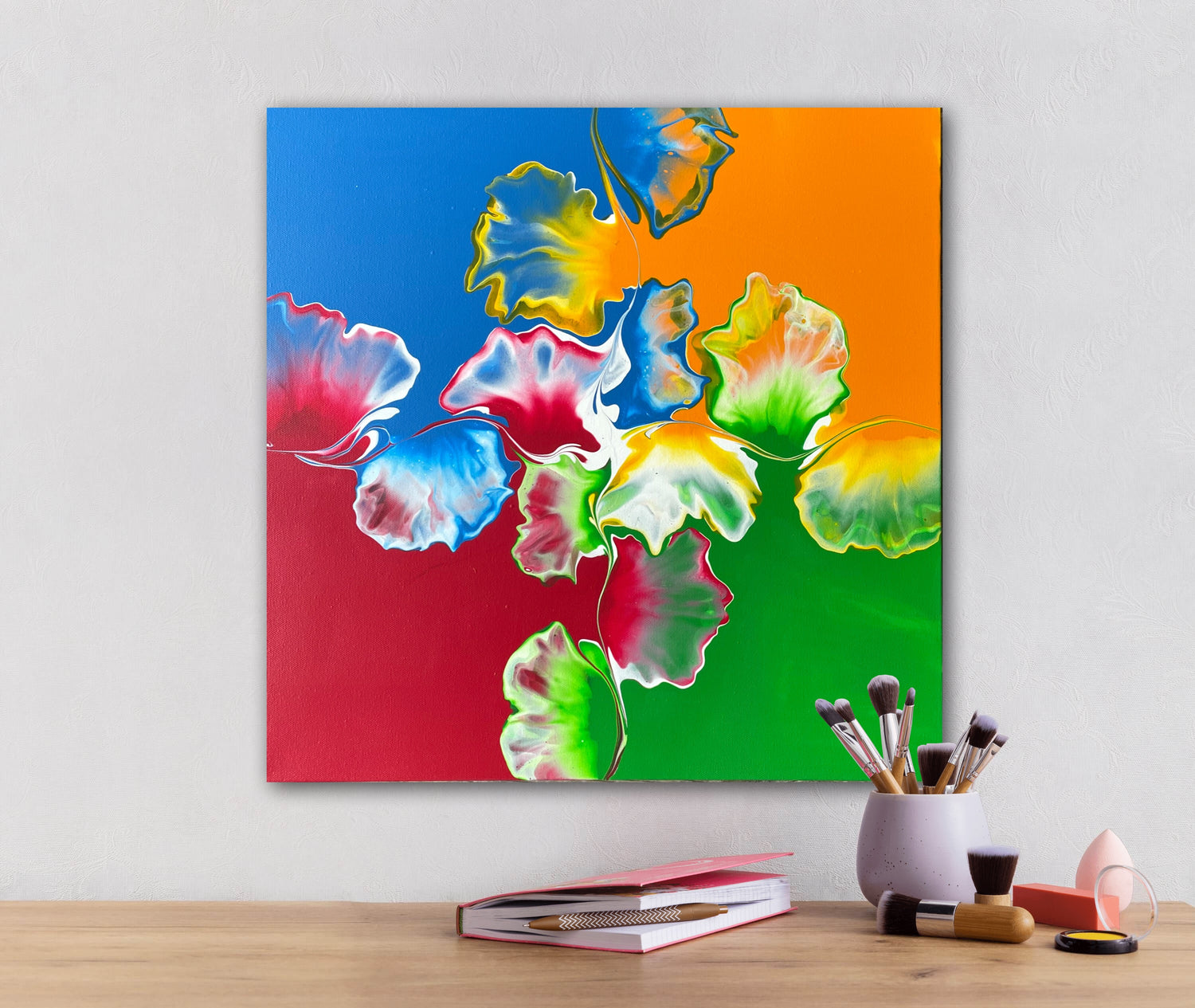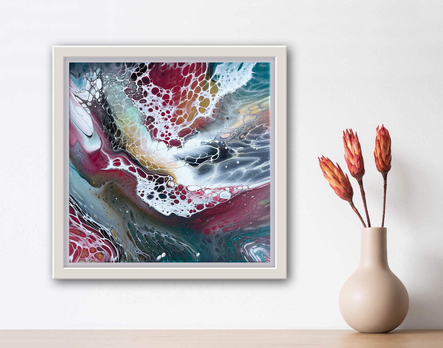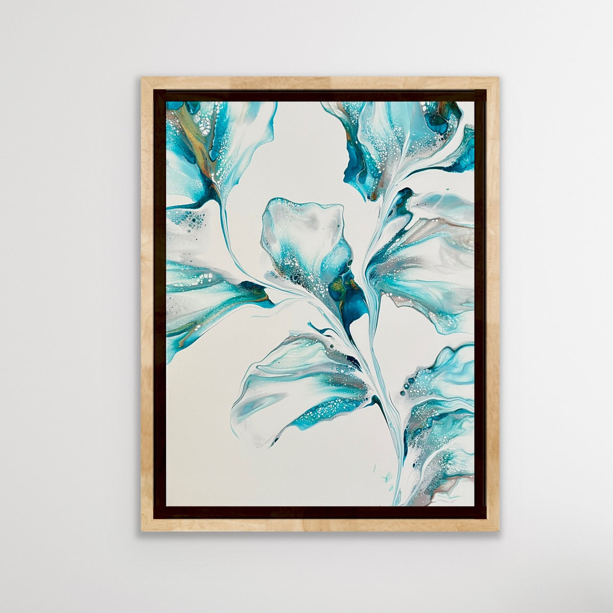 From a new series on texture and flow, Becca plays with uncommon texture elements added to her cavas. Then pairs them with the blending of fluid colors to create a stunning, vibrant and unique painting.