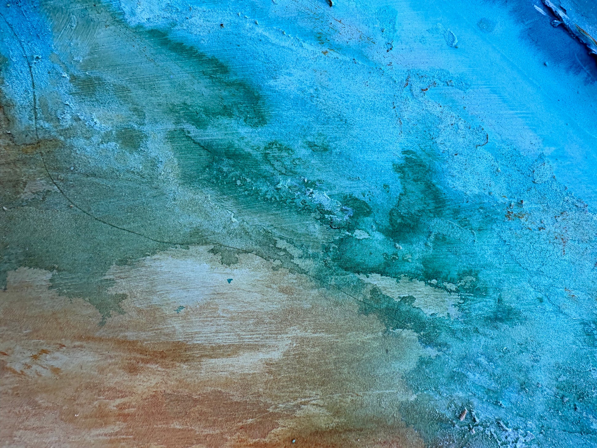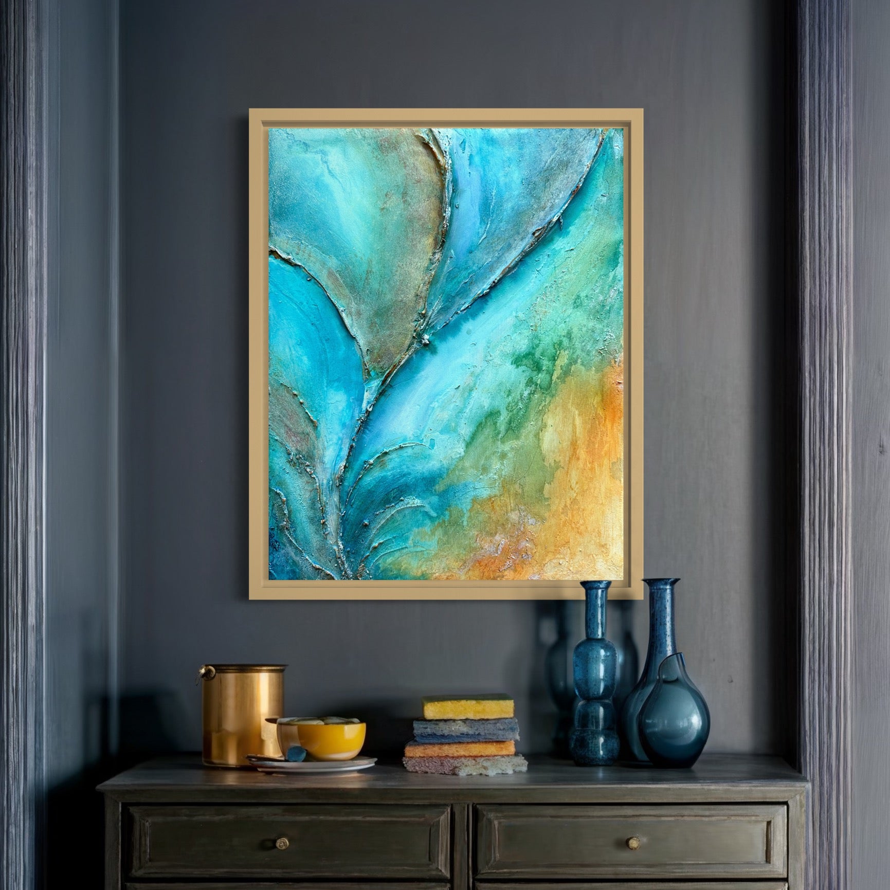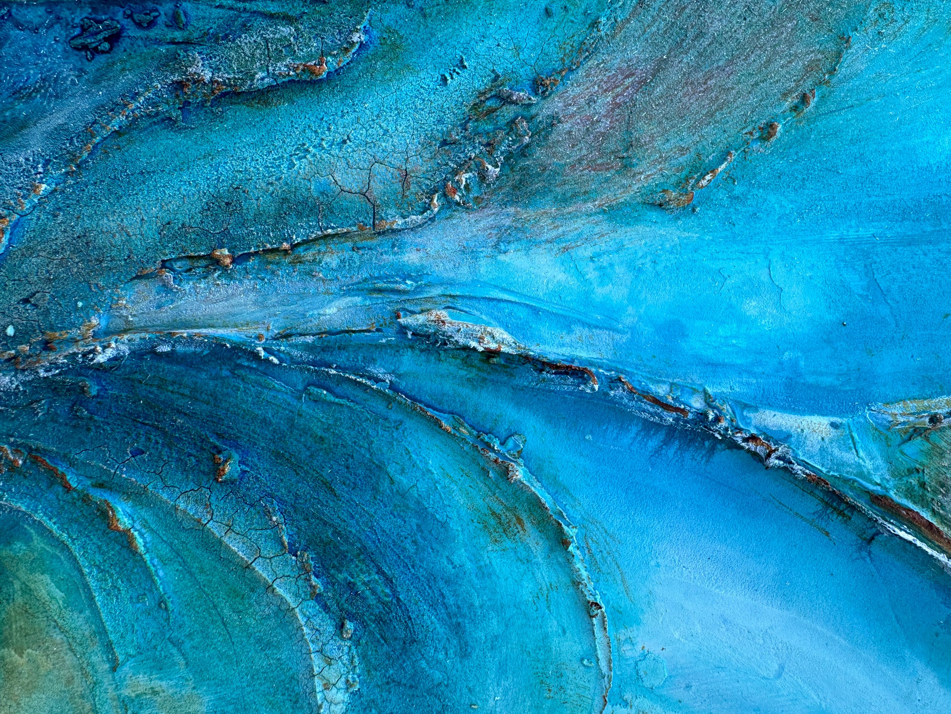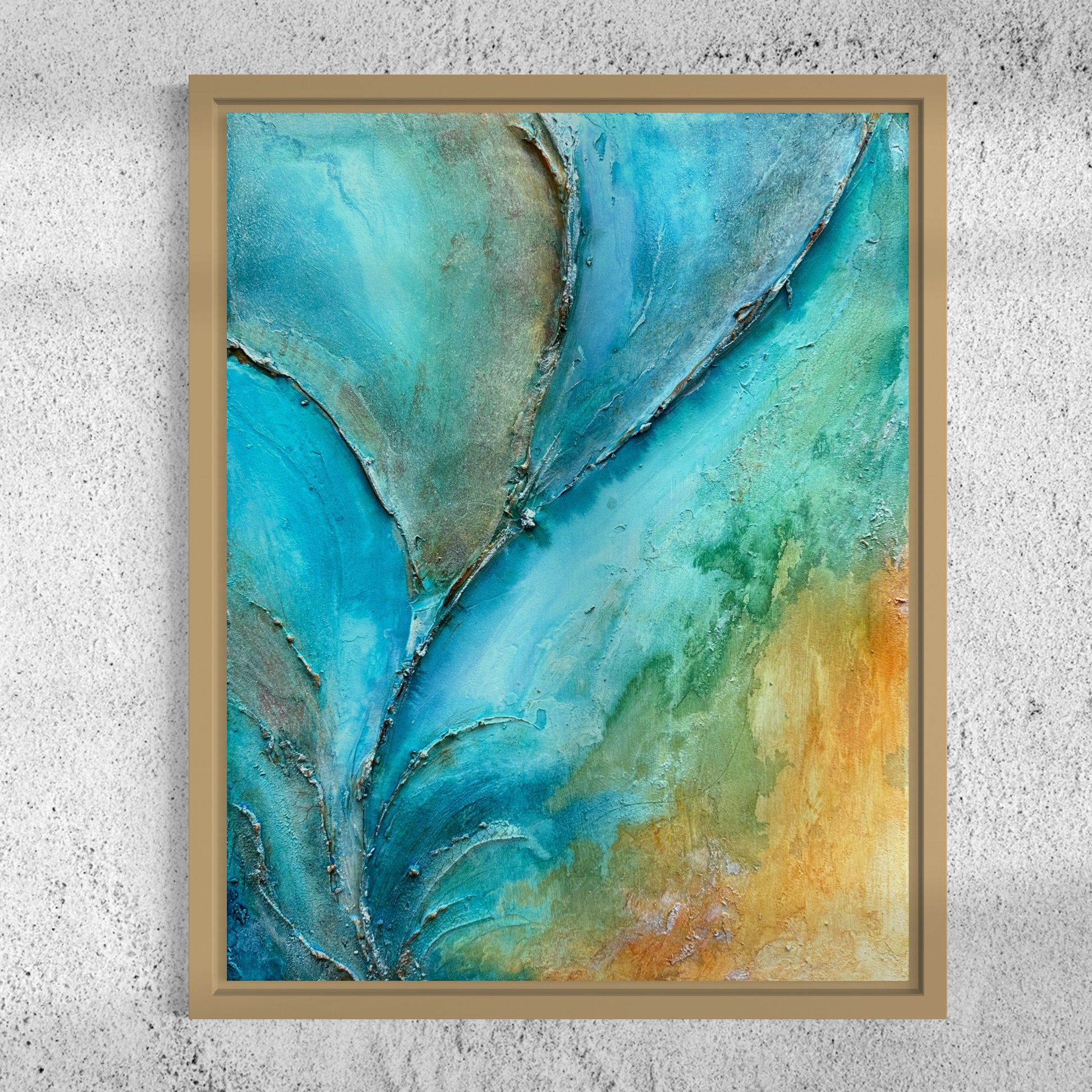 In Becca Harkins' mixed media painting, a mesmerizing blend of teal and goldenrod hues captures the eye with its intricate textures. Layers of acrylic paint are expertly applied, creating a rich depth that draws the viewer in. The teals and blues dominate the canvas, blending with goldenrod accents that add warmth and contrast. Harkins employs textured building up the surface with rough peaks and delicate washes. The interplay of light and shadow across the textured surface creates a dynamic play of movement. Becca's skilled use of mixed media techniques not only enhances the visual appeal but also invites tactile exploration, making the artwork a captivating sensory experience.